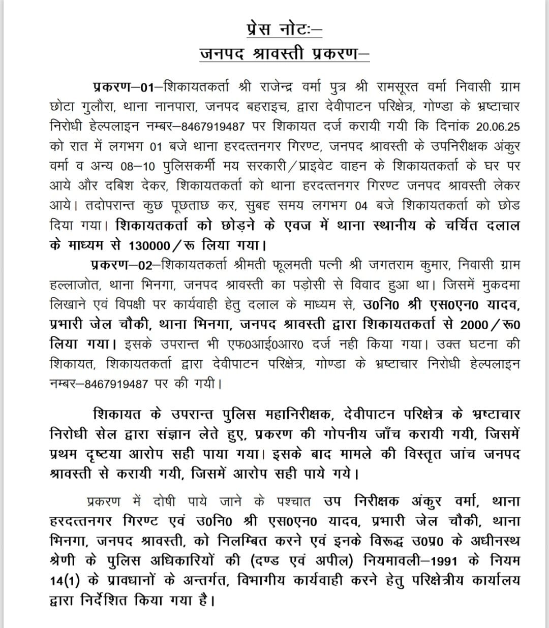 श्रावस्ती। देवीपाटन मंडल के आईजी अमित पाठक ने रिश्वतखोरी के मामले में सख्त कार्रवाई की है। दो सब इंस्पेक्टरों को तत्काल प्रभाव से निलंबित कर दिया गया है।